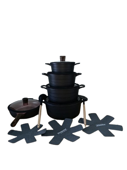 Accessories: The set comes with 3-piece pot protectors and silicone utensils.